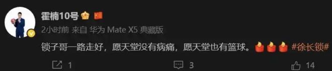 现任四川锦城蓝鲸篮球俱乐部副总经理霍楠也发文表示哀悼:“锁子哥一路走好,愿天堂没有病痛,愿天堂也有篮球。”